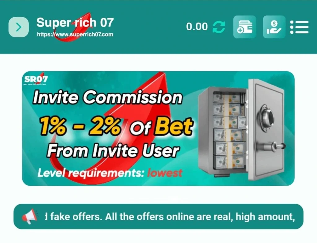 Super Rich07 also provides a referral earning system. Players can share their referral link or code with friends. When someone joins using that code the player receives bonus. This bonus can be used to play games and increase earnings. It encourages users to invite more people. This is a simple method to earn extra money without investment. It makes the platform grow while rewarding active players.